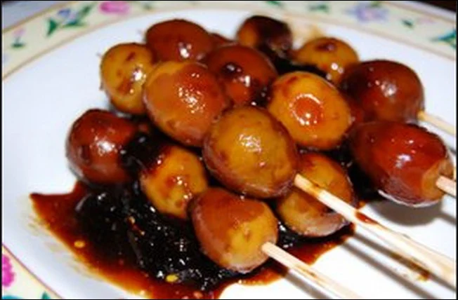 Sate telur puyuh juga banyak dijual,sate ini biasanya untuk teman makan soto.sate ini dari telur puyuh yang dibacem lalu ditusuk dengan tusukan sate.